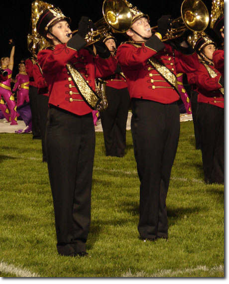 Jill T and Jacob P reach their horns to the crowd as they perform the first part of their show.